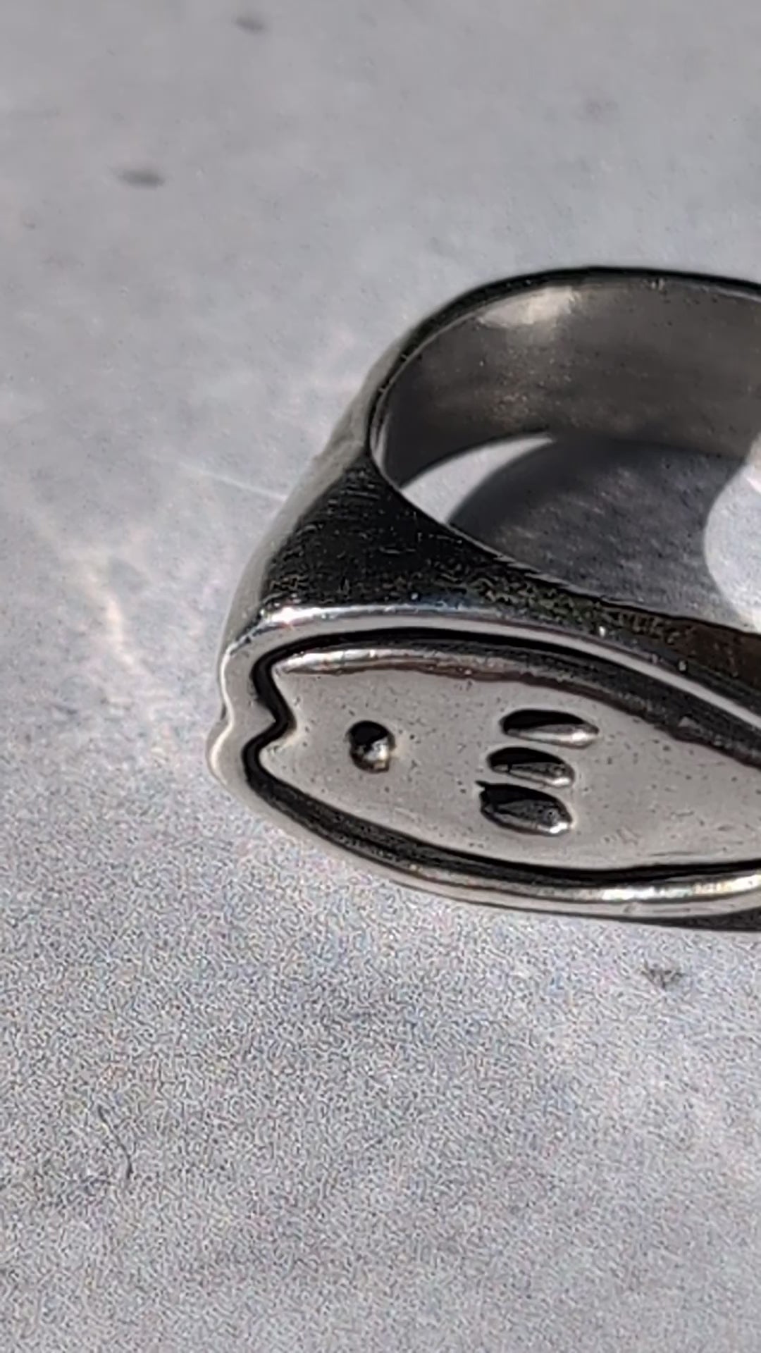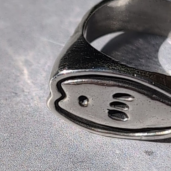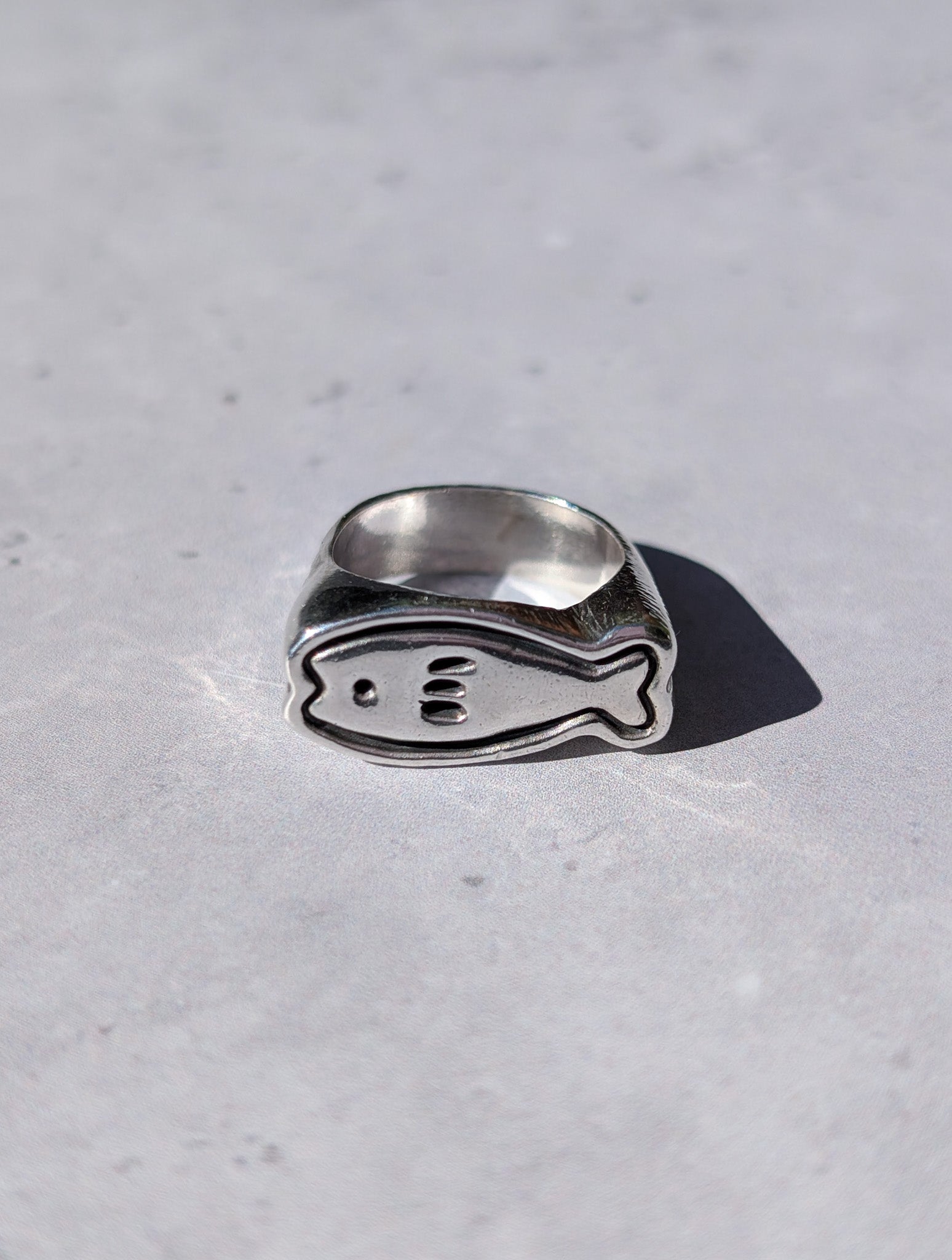 Hand-carved Fish ring made in the UK. Made by hand using traditional techniques, including hand-carving, hand polishing and finishing. The ring is made using solid 925 silver and weighs approx 15g. As the ring is completely hand-made small variations will be present, making each ring completely unique.